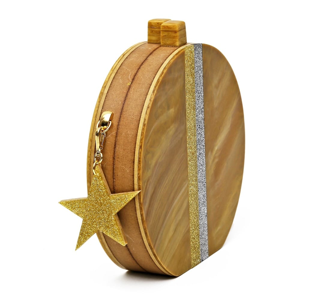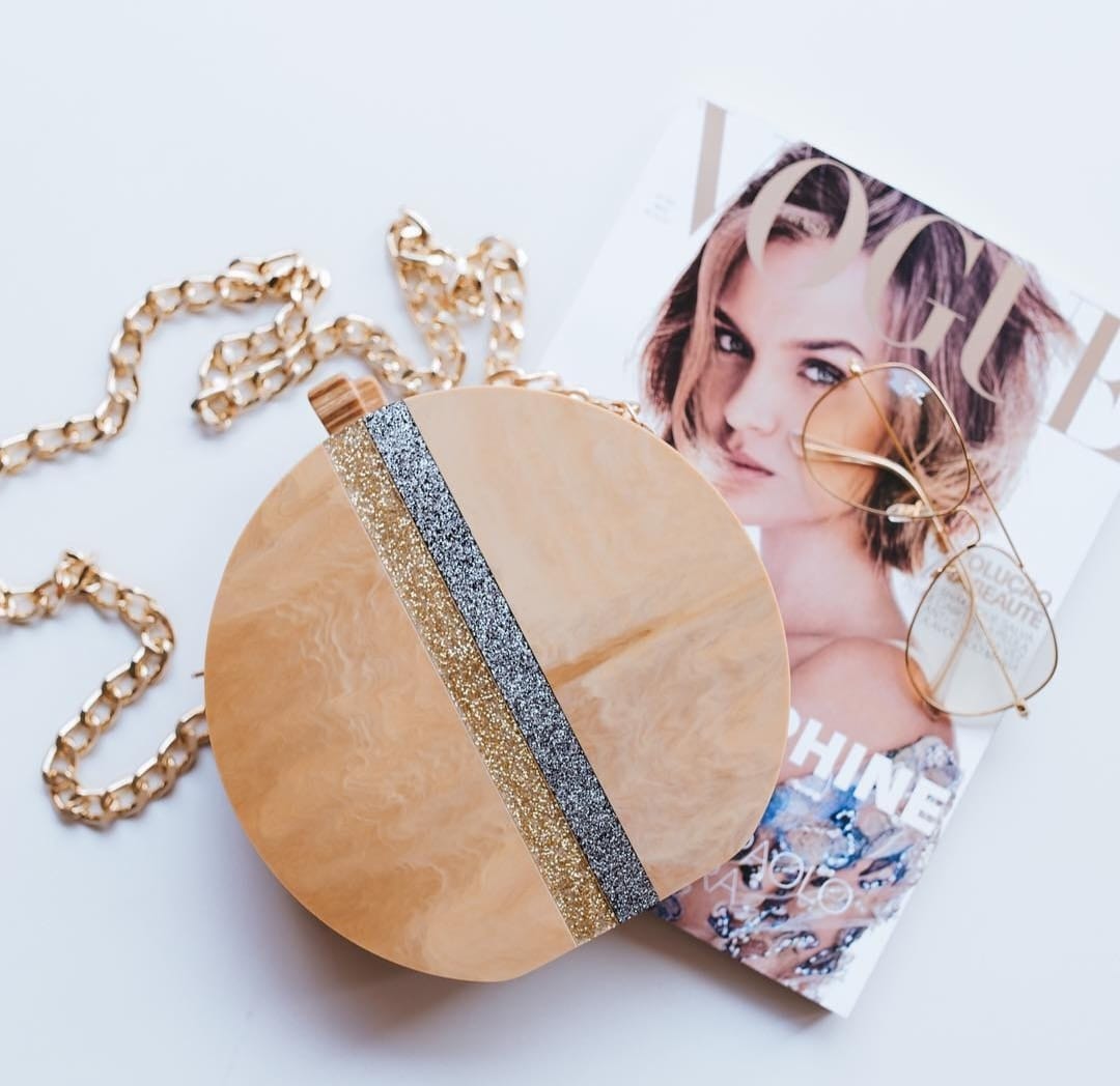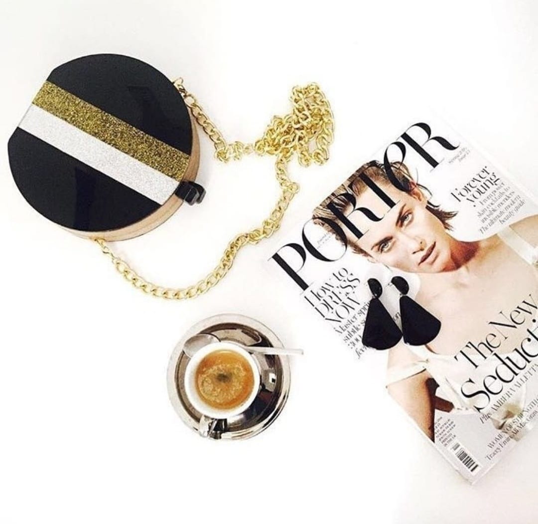 Confeccionada à mão em acrílico e madeira sustentável. Possui botões magnéticos para o seu fechamento e metais banhados a ouro. A bolsa acompanha alça corrente removível, assim, você pode usar como clutch ou como bolsa tiracolo.
