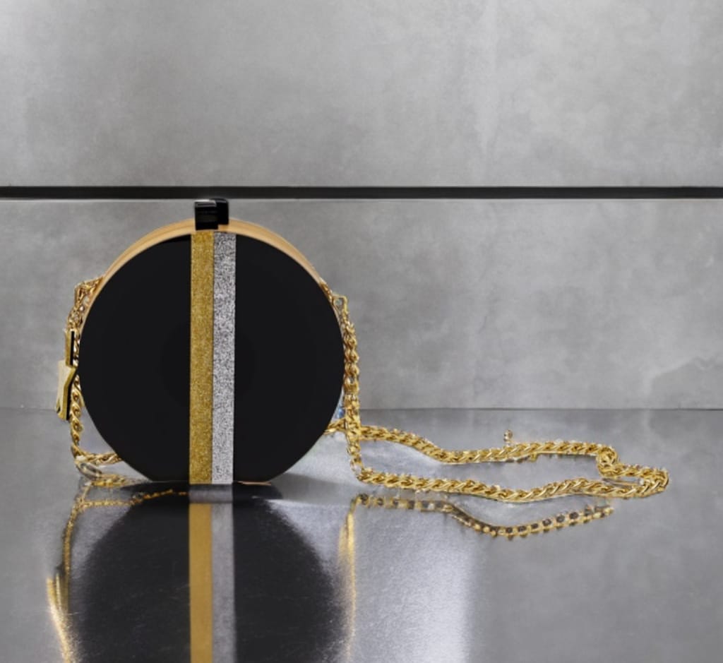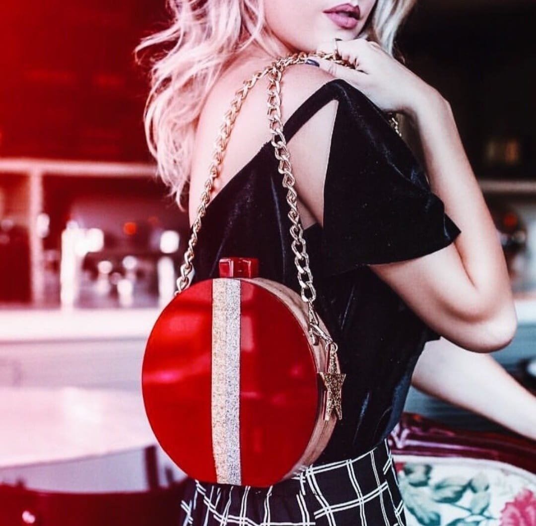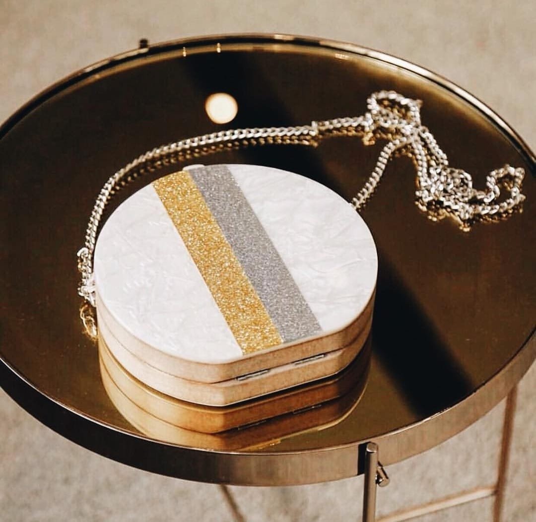 Confeccionada à mão em acrílico e madeira sustentável. Possui botões magnéticos para o seu fechamento e metais banhados a ouro. A bolsa acompanha alça corrente removível, assim, você pode usar como clutch ou como bolsa tiracolo.