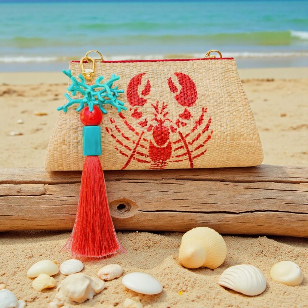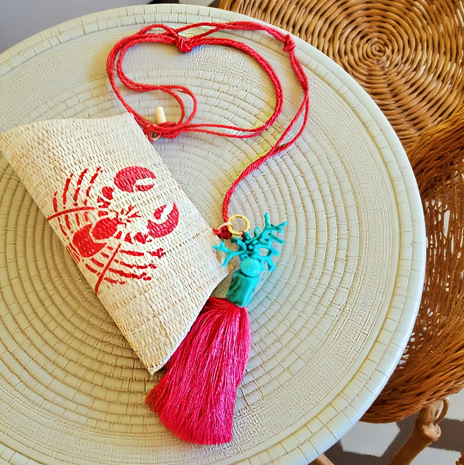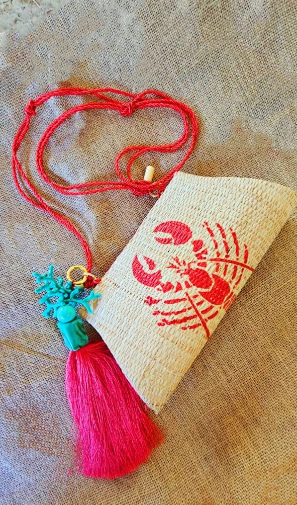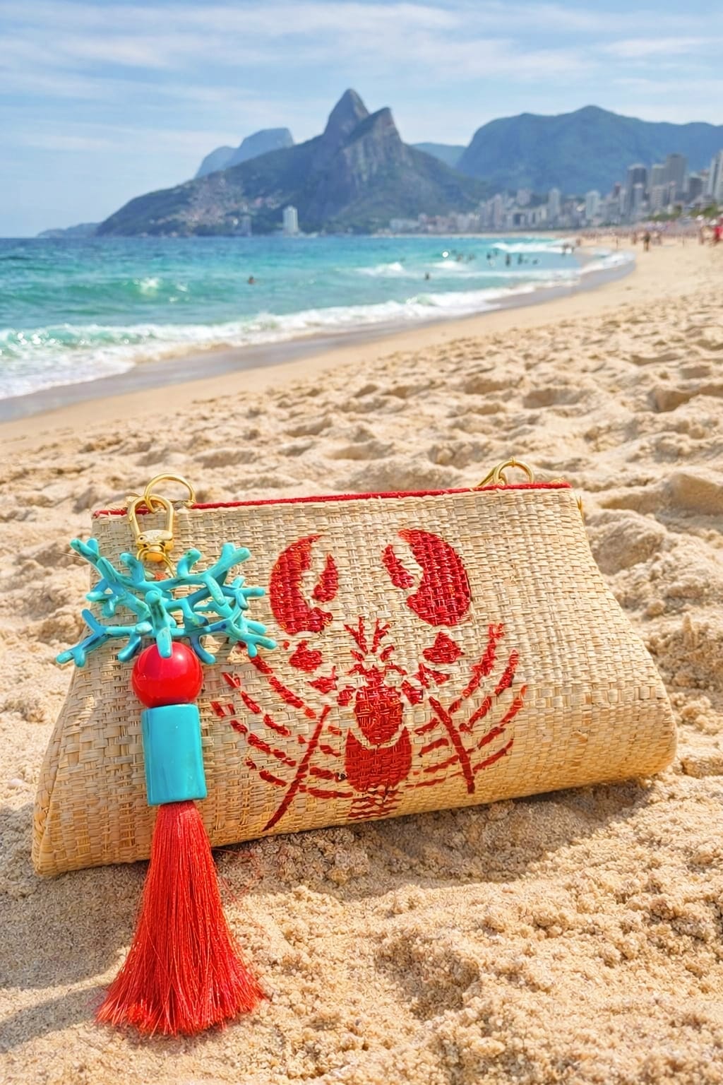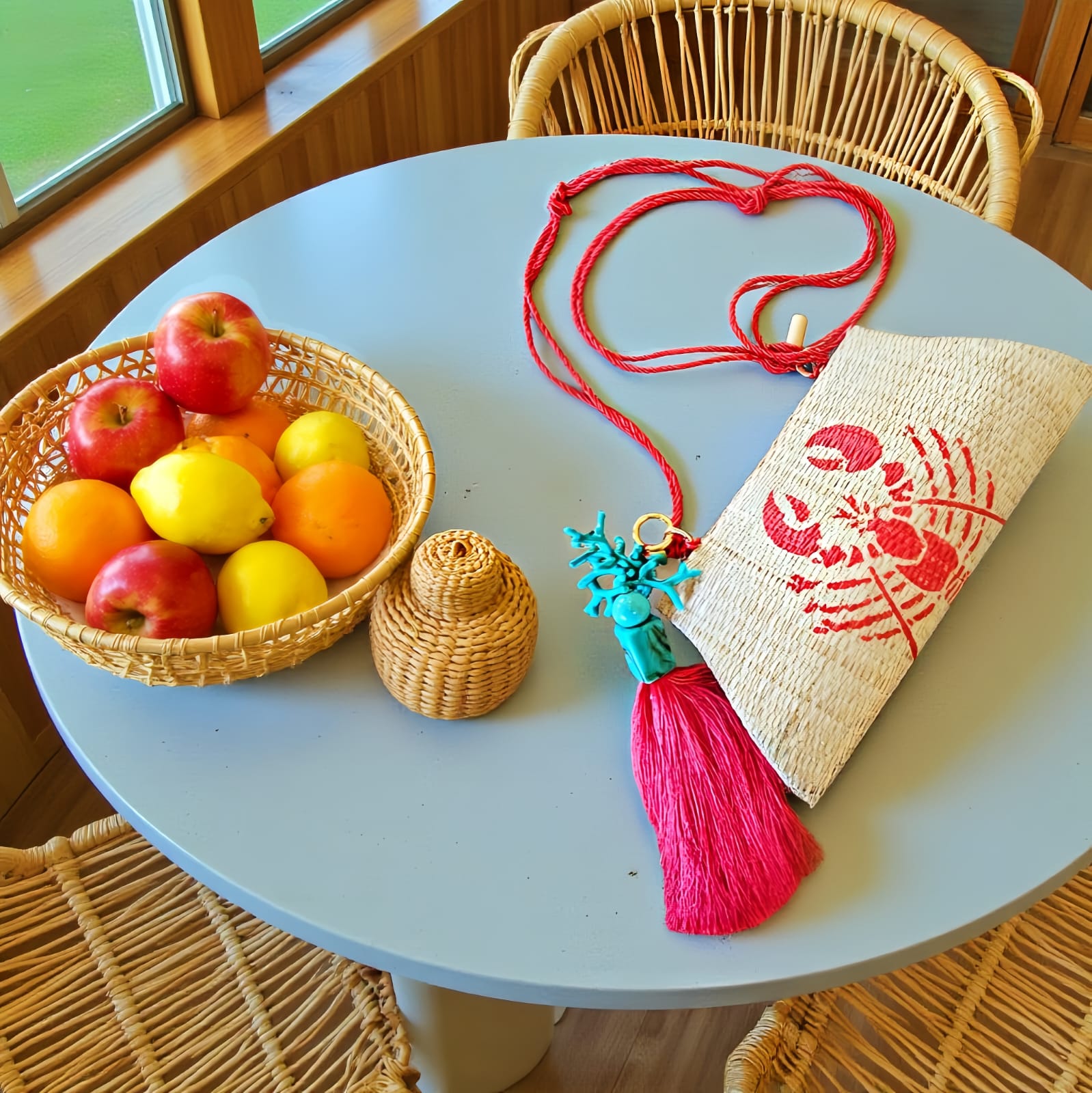 Confeccionada e pintada à mão em palha natural de buriti. Possui detalhes em resina, tassel em fio de seda e alça tiracolo removível.
