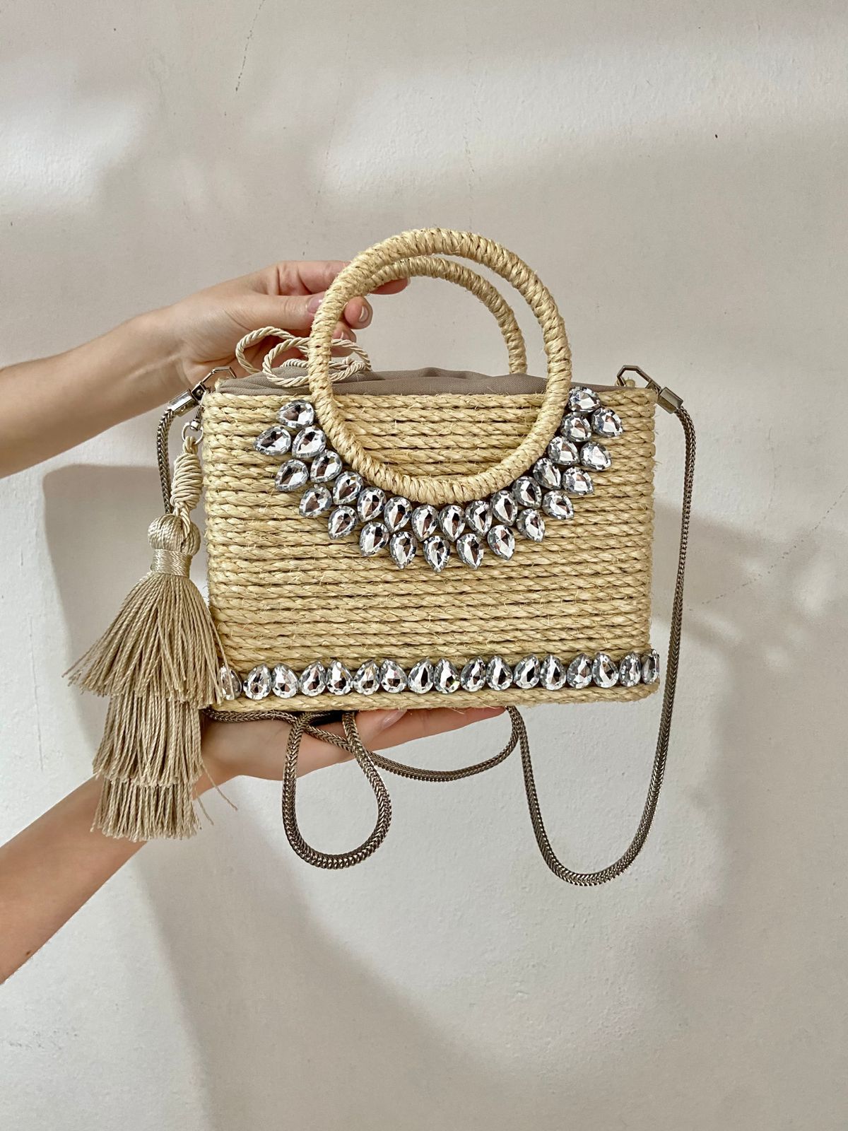 Confeccionada à mão em sisal e aplicações de cristais. Possui forro acoplado na bolsa e duas alças: uma fixa e a outra tiracolo removível.