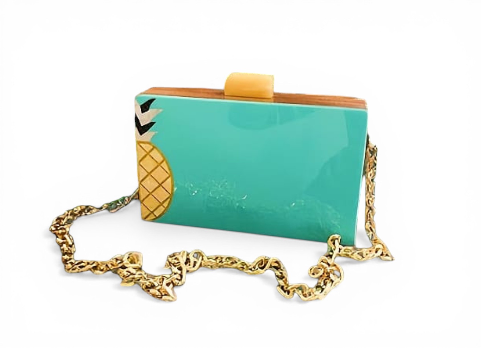 Confeccionada à mão em acrílico e madeira sustentável. Possui botões magnéticos para o seu fechamento e metais banhados a ouro. A bolsa acompanha alça corrente removível, assim, você pode usar como clutch ou como bolsa tiracolo.