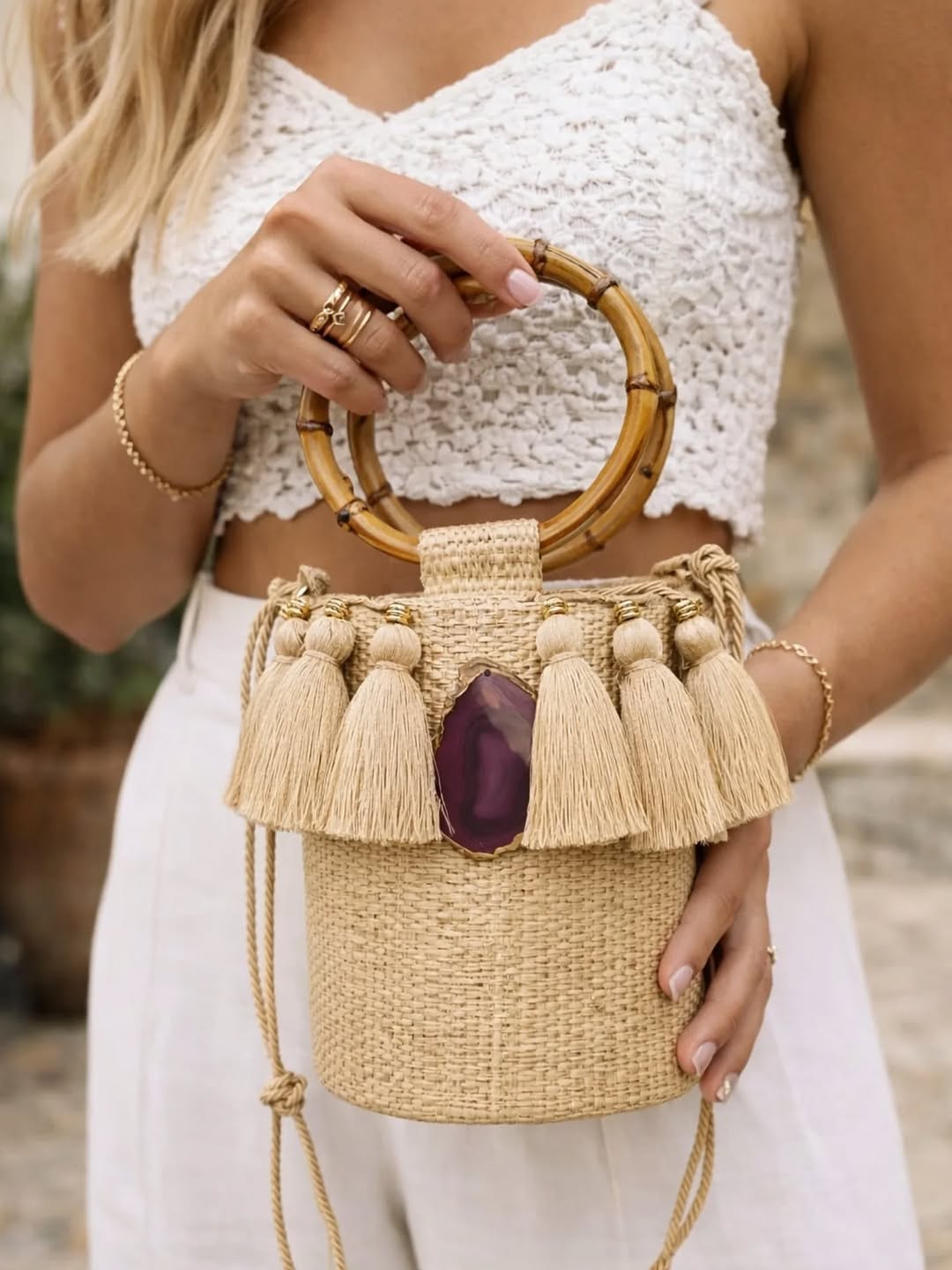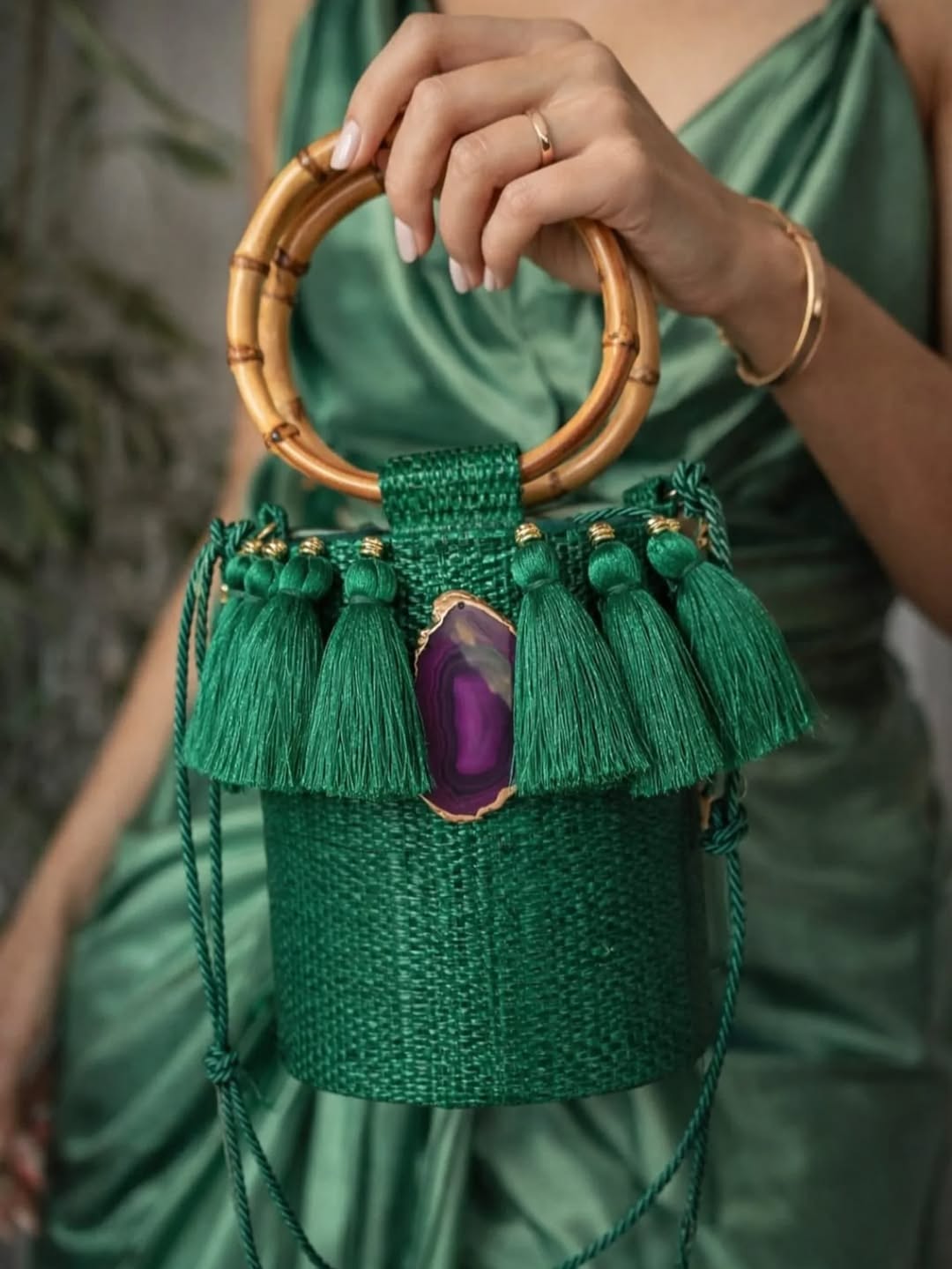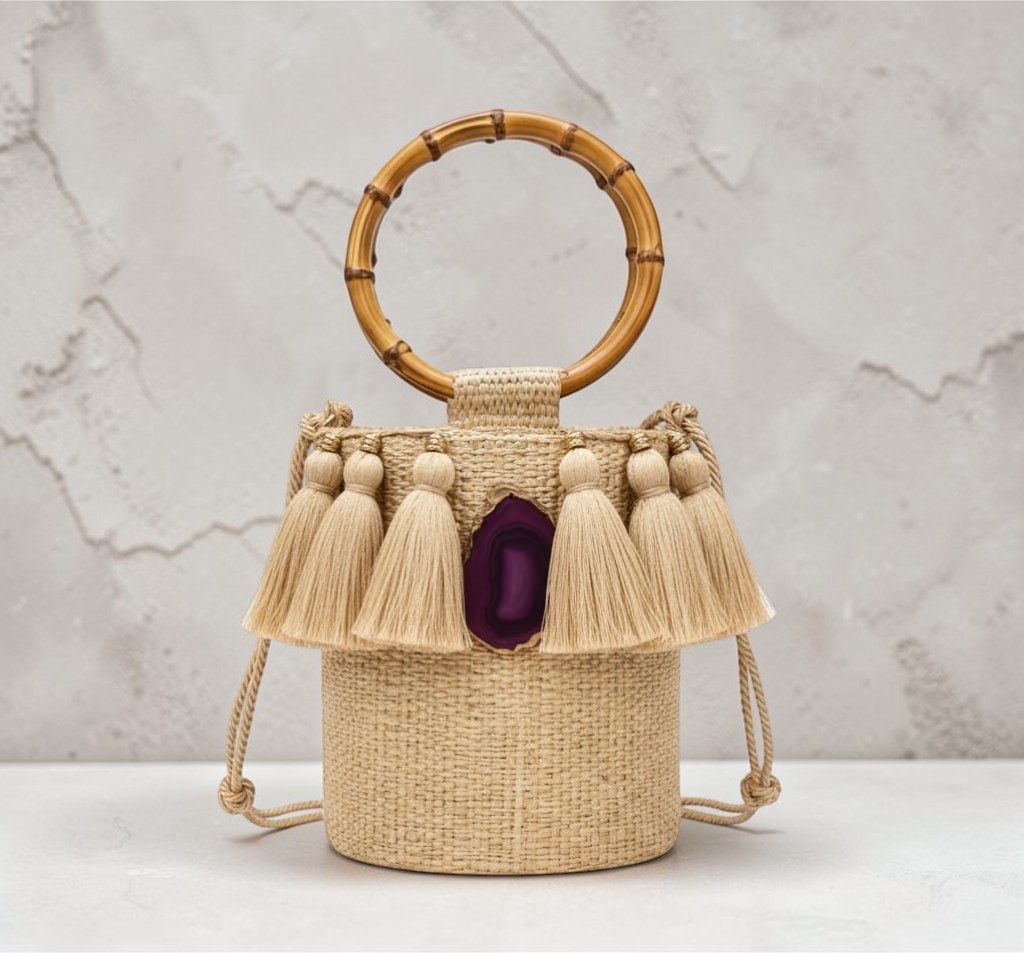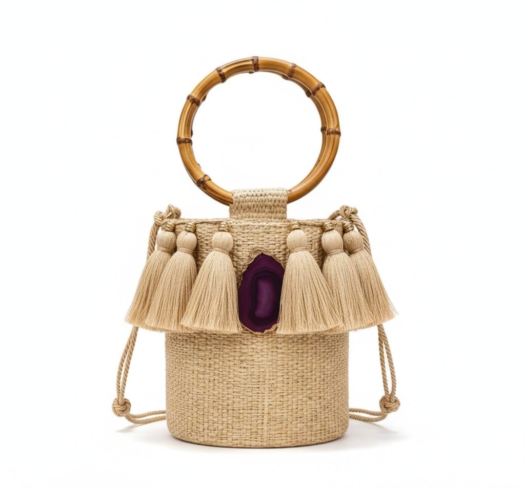Confeccionada em palha brasileira e tingimento artesanal, ela acompanha duas opções de alças. Uma alça tiracolo de cordão removível e uma alça de mão fixa.