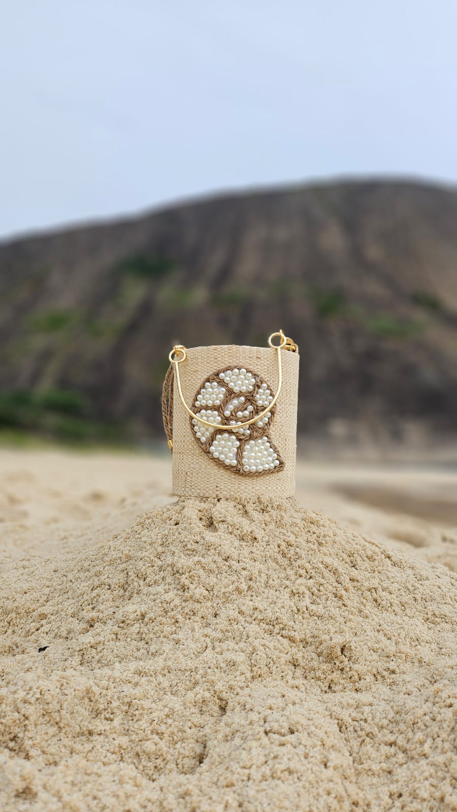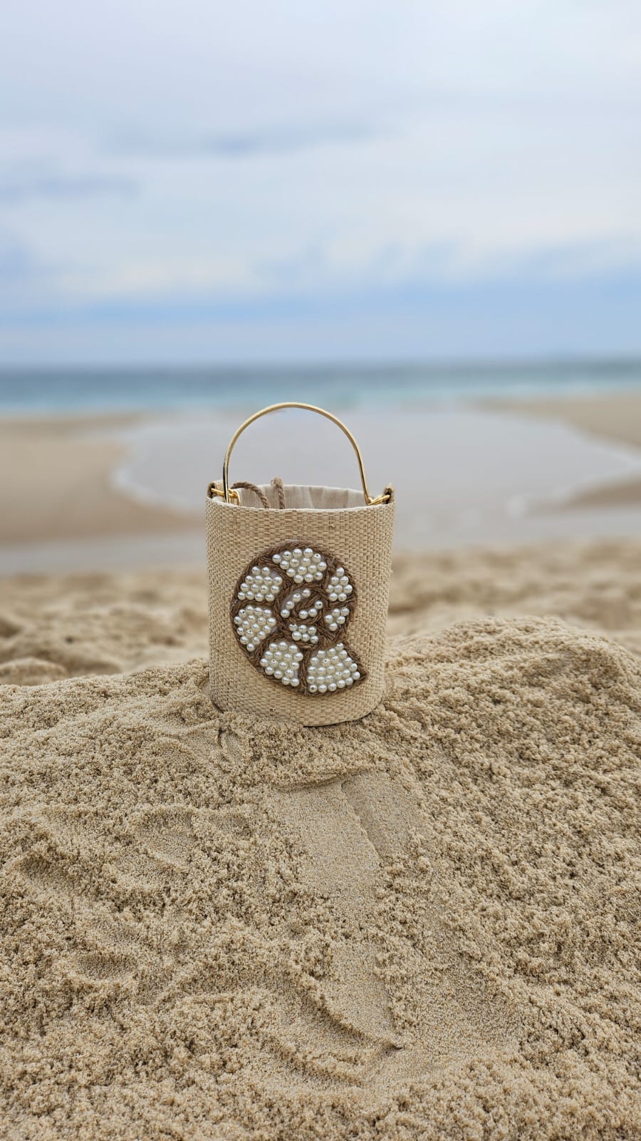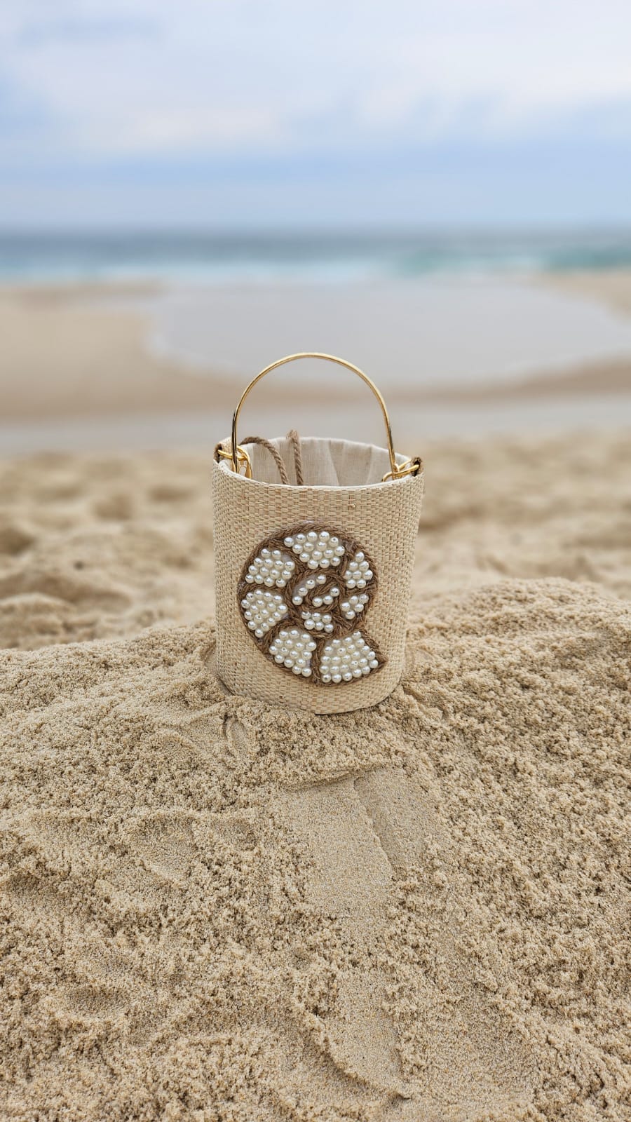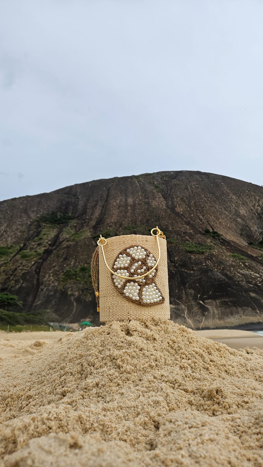 Confeccionada à mão em palha, detalhes em pérola, metais banhados à ouro e forro 100% algodão.