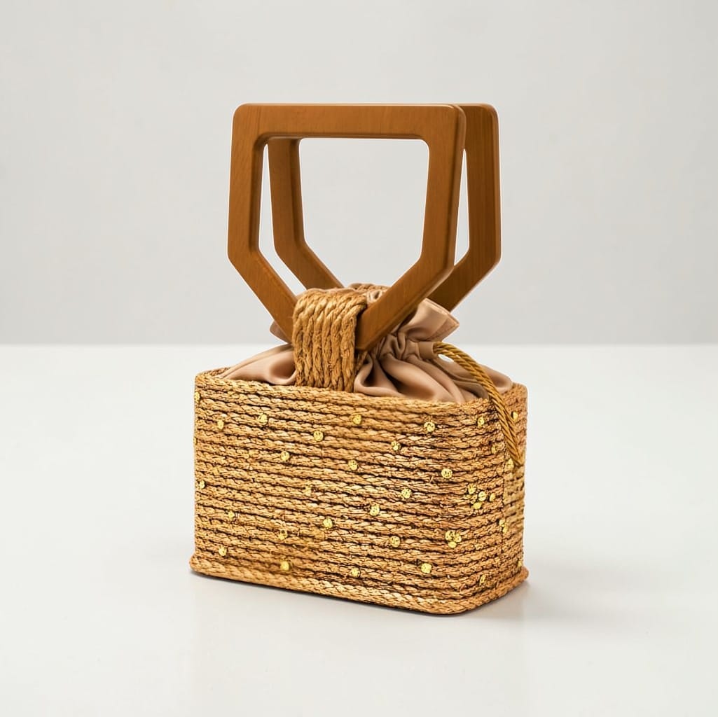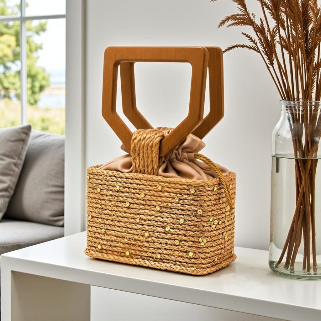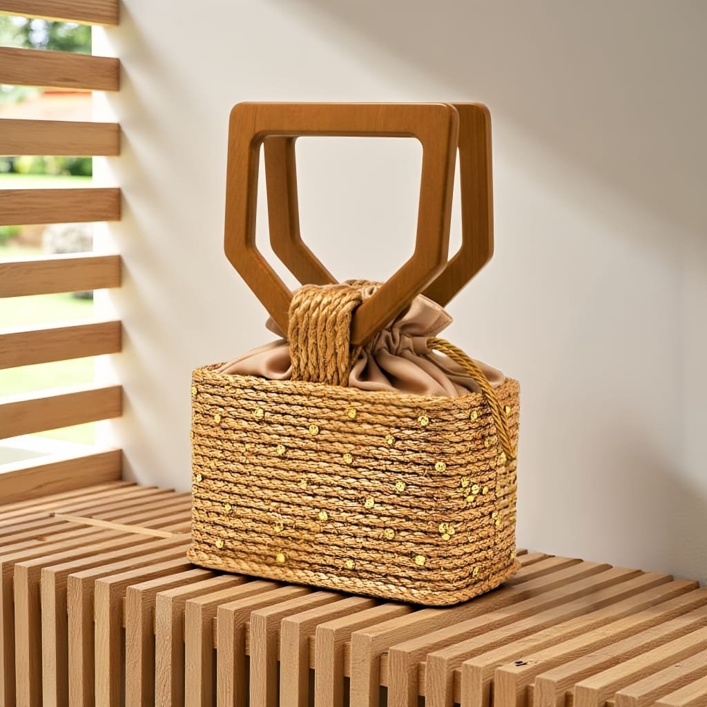 Confeccionada e pintada à mão em sisal natural com aplicações de cristais. Possui alça removível tiracolo.