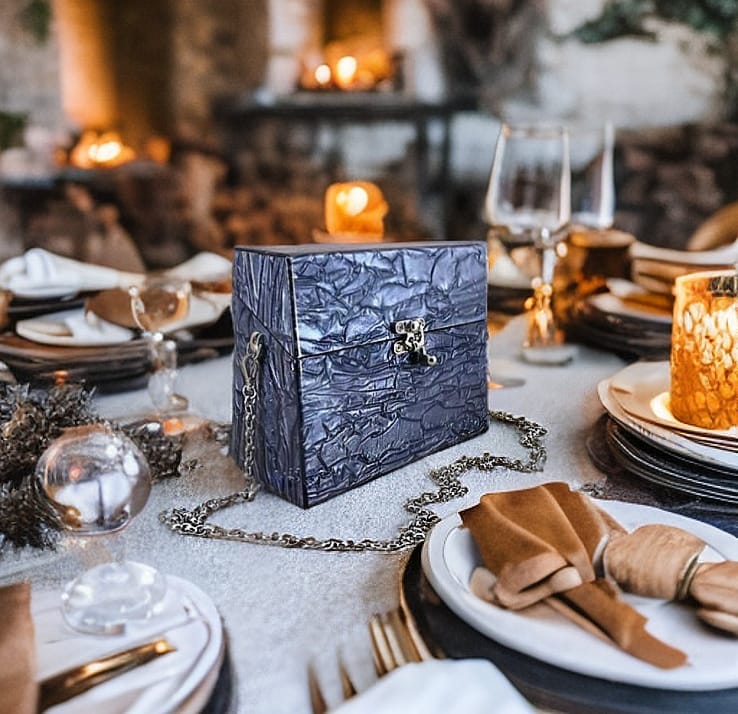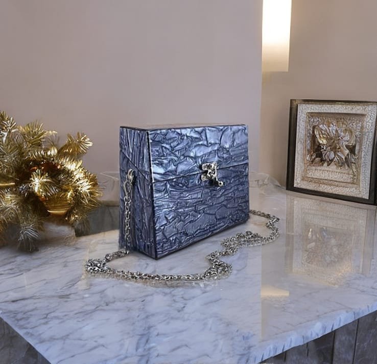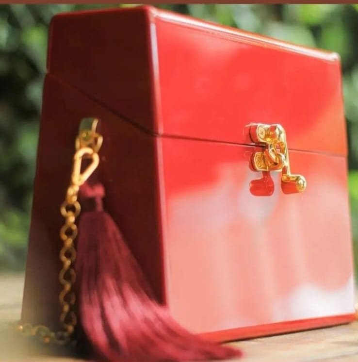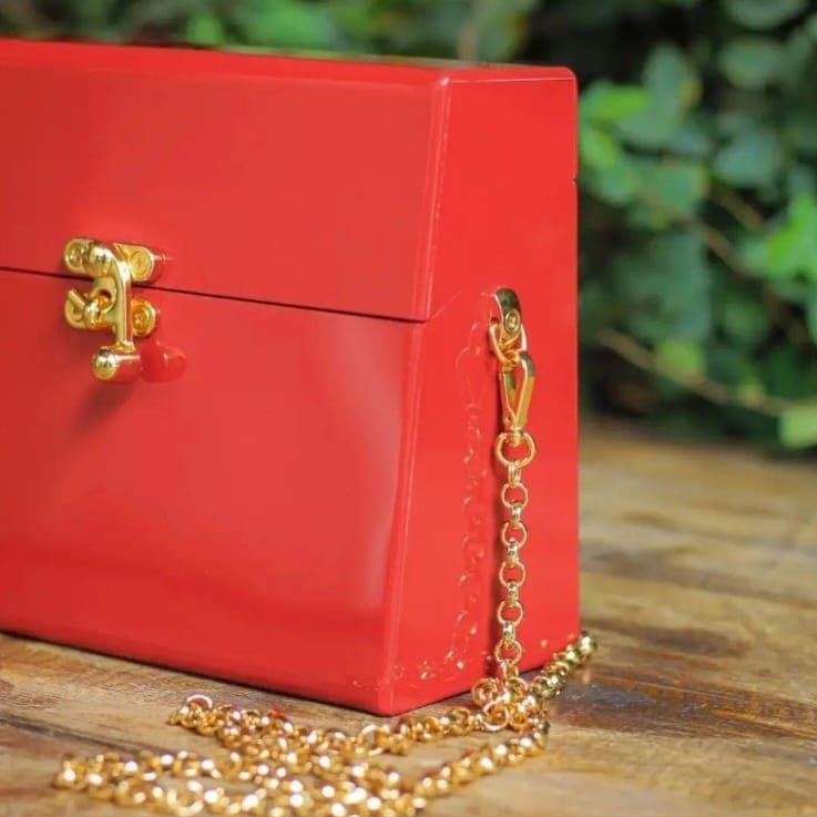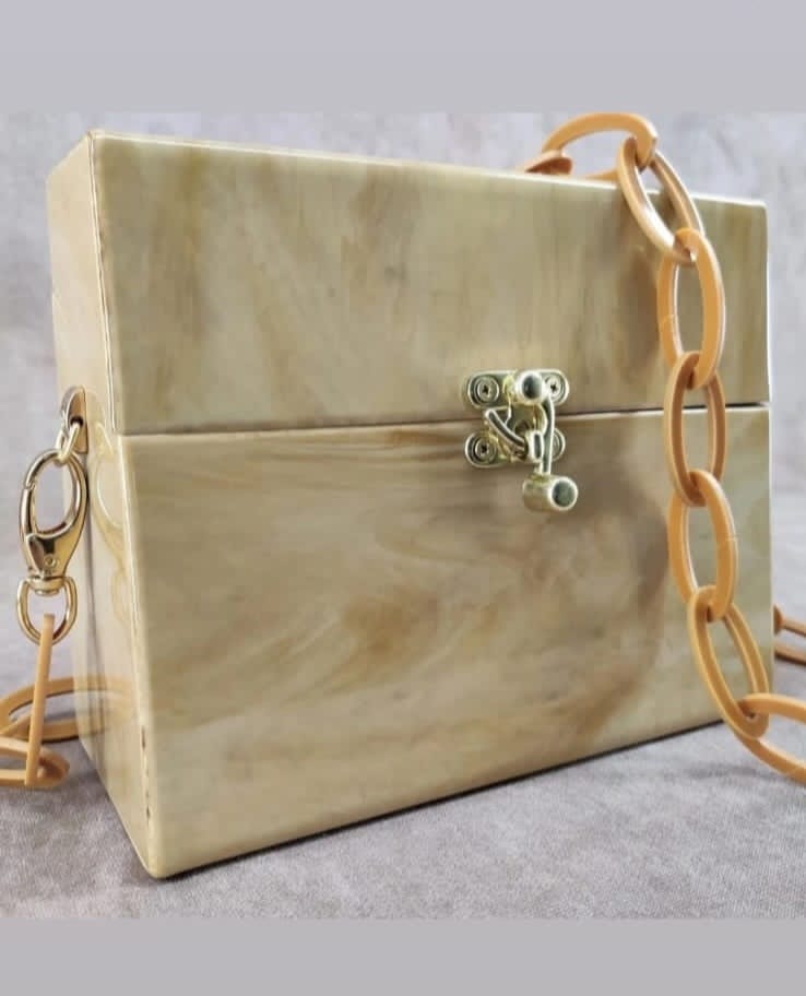 Confeccionada à mão em acrílico. Possui botões magnéticos para o seu fechamento e metais banhados a ouro. A bolsa acompanha alça corrente removível, assim, você pode usar como clutch ou como bolsa tiracolo.