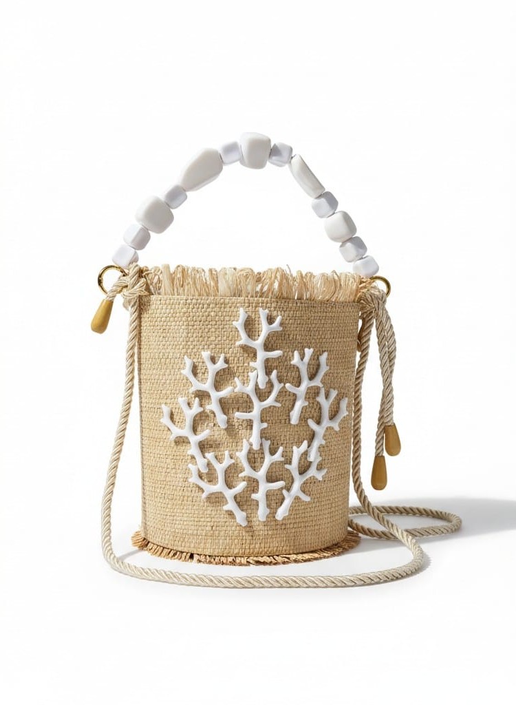 Confeccionada à mão em palha natural. Possui duas alças removíveis, uma tiracolo e a outra de mão em resina.