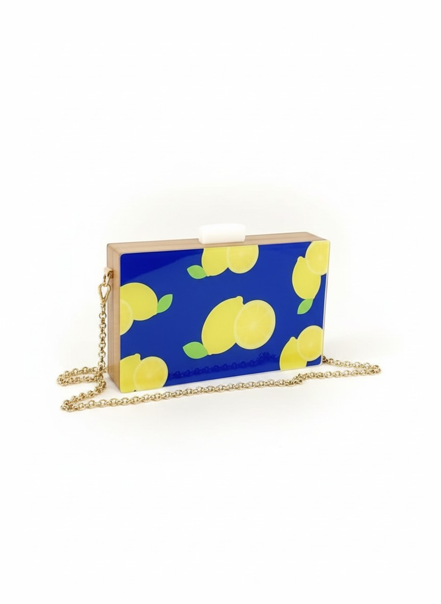 Confeccionada à mão em acrílico. Possui botões magnéticos para o seu fechamento e metais banhados a ouro. A bolsa acompanha alça corrente removível, assim, você pode usar como clutch ou como bolsa tiracolo.