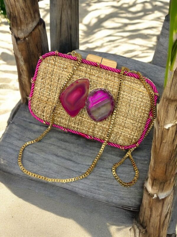 Confeccionada em palha, pedra de ágata natural e corrente veneziana.